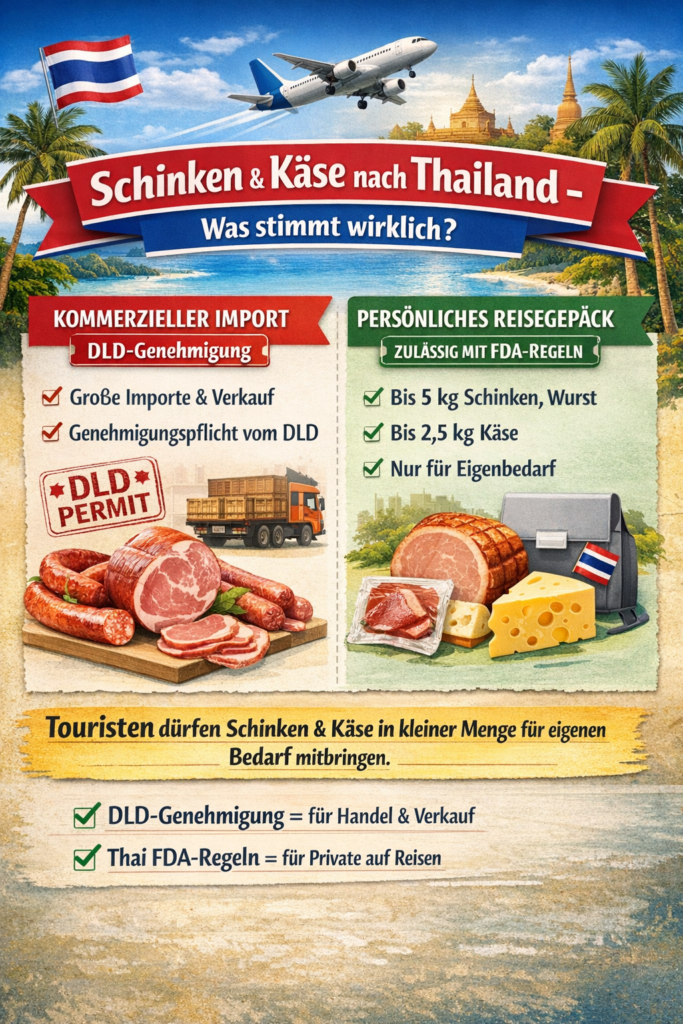 Wer Fleischprodukte über die Grenze bringt, gilt rechtlich als Importeur – ganz egal, ob Großhändler oder Urlauber mit Rucksack. Ohne Genehmigung des zuständigen Department of Livestock Development ist die Einfuhr illegal, selbst bei kleinsten Mengen.