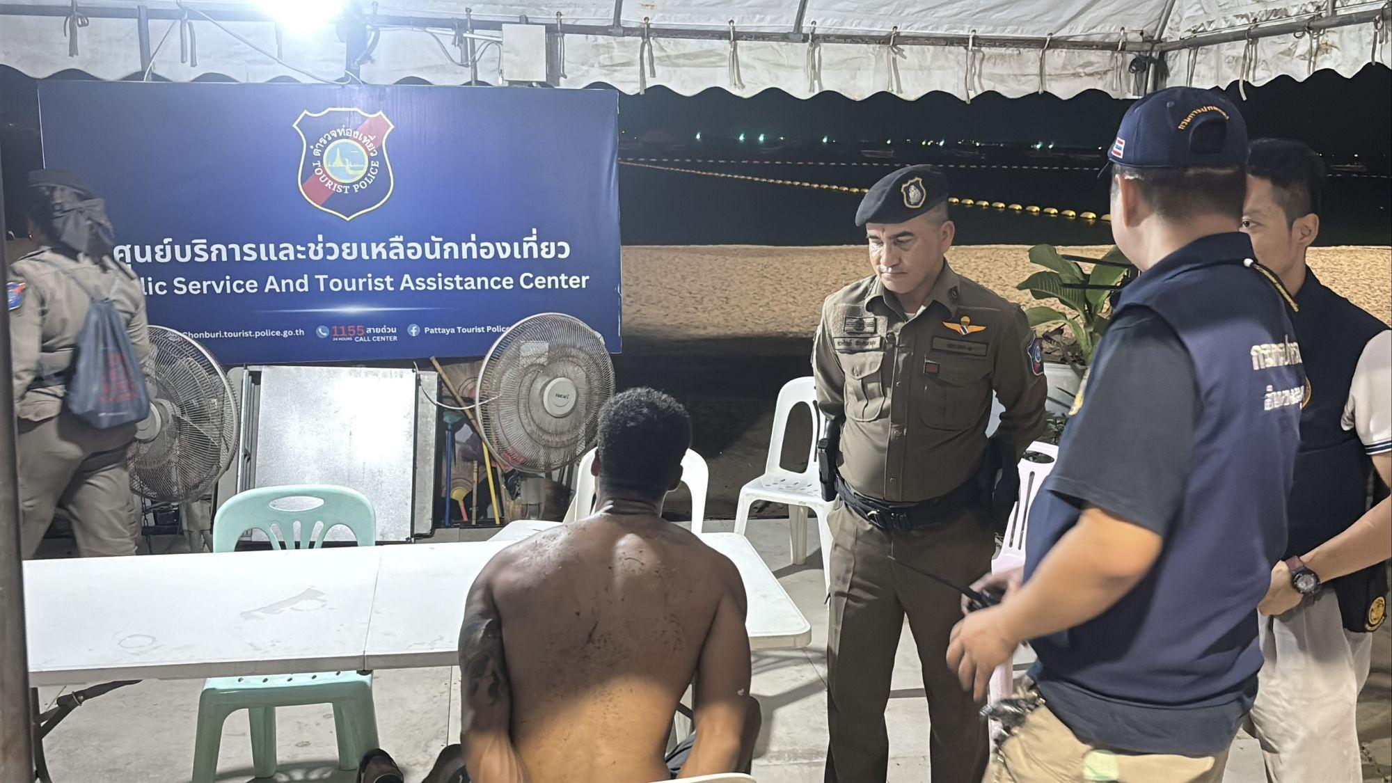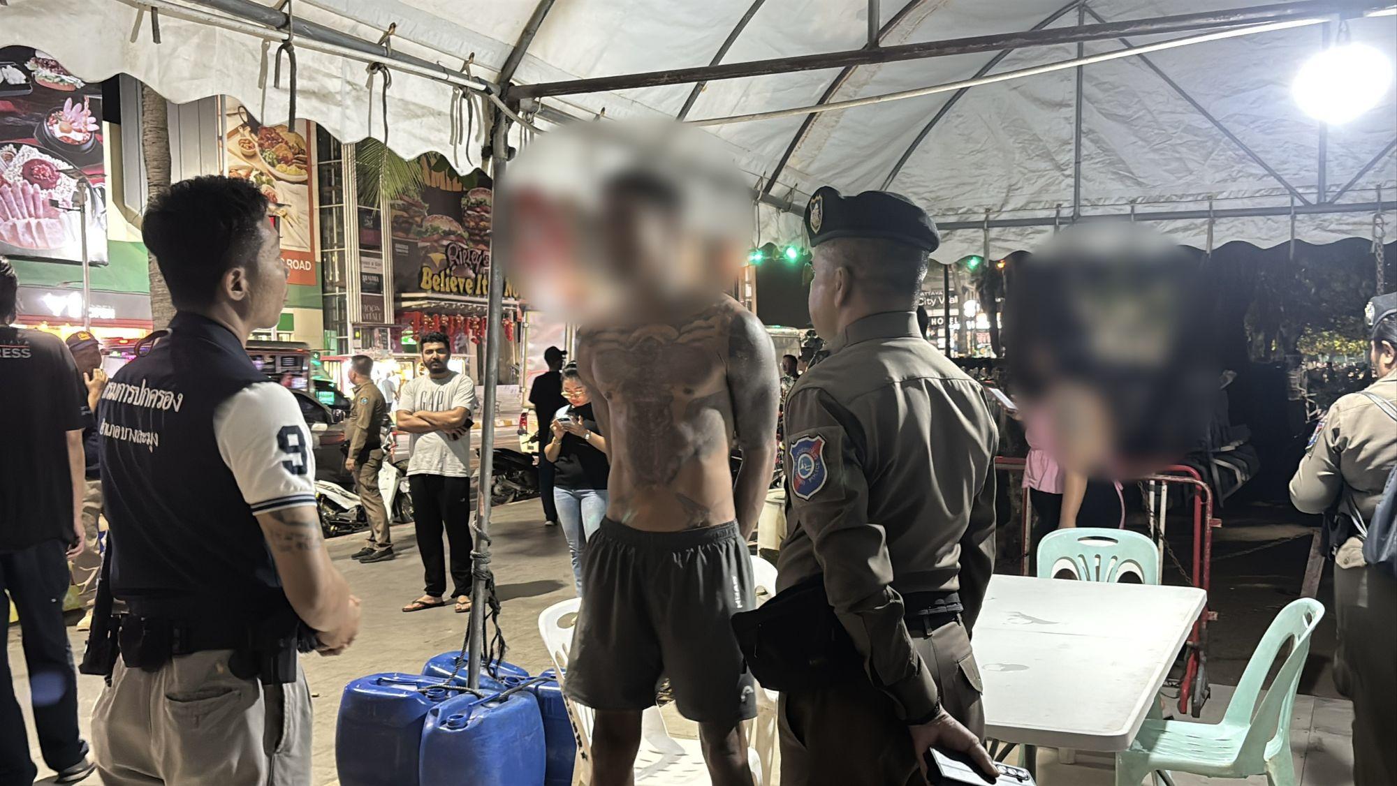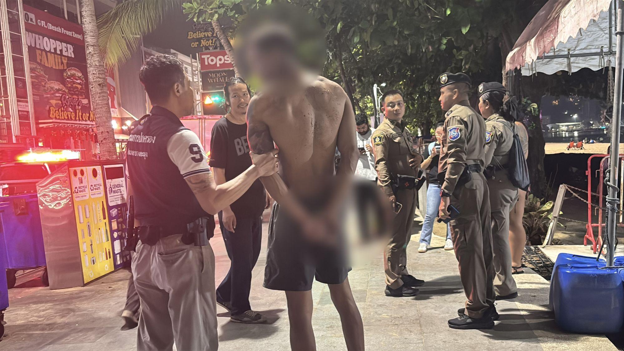 Der Vorfall ereignete sich gegen 1:30 Uhr morgens, als Beamte der Touristenpolizei Pattaya, der Polizeistation Pattaya und lokale Verwaltungsbeamte auf Meldungen über einen ausländischen Staatsangehörigen reagierten, der auf der Strandstraße am Pattaya Beach in der Nähe eines kleinen Cannabis-Shops Chaos verursachte.