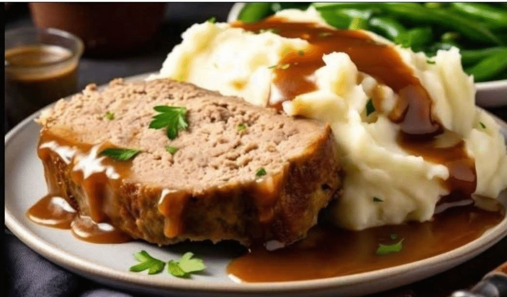 Hackbraten mit Kartoffelpüree, Karotten und brauner Sauce.