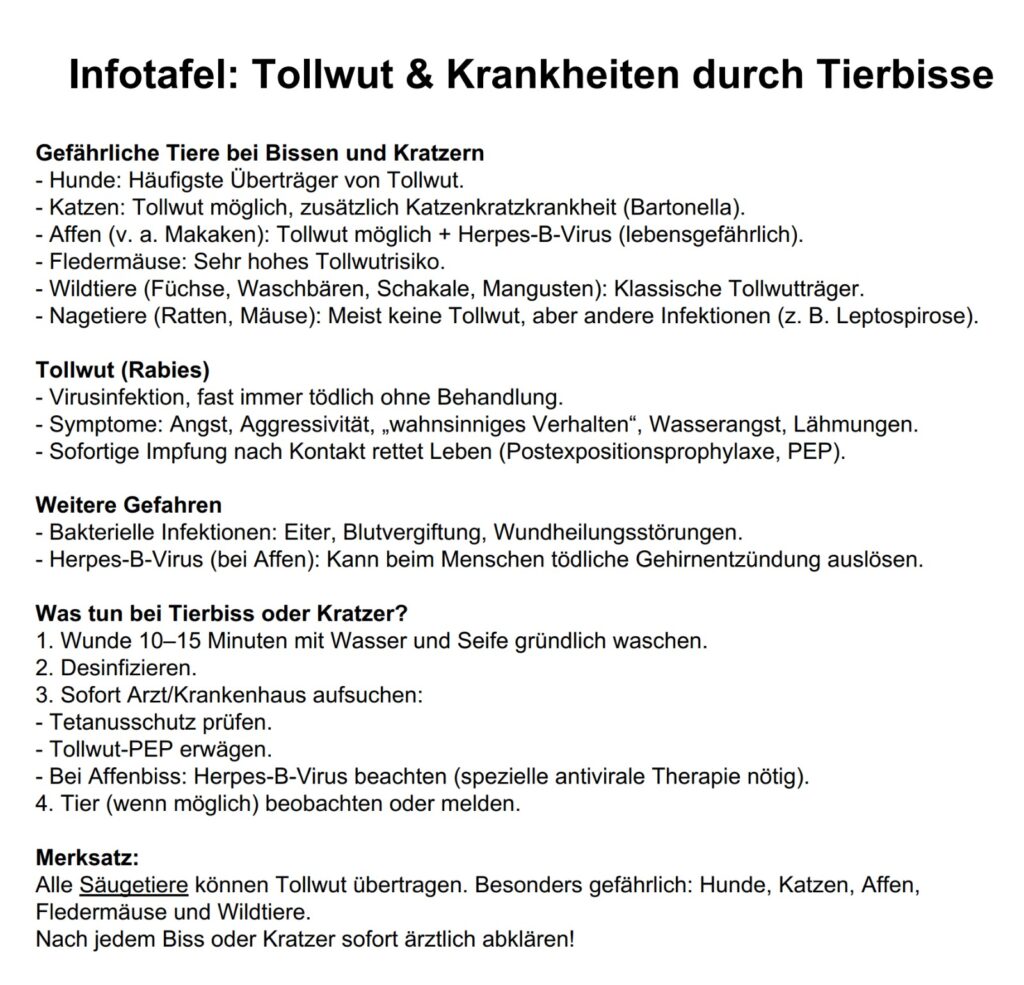 - Bei Affenbiss: Zusätzlich Herpes-B-Virus beachten → spezielle antivirale Behandlung (z. B. Aciclovir).