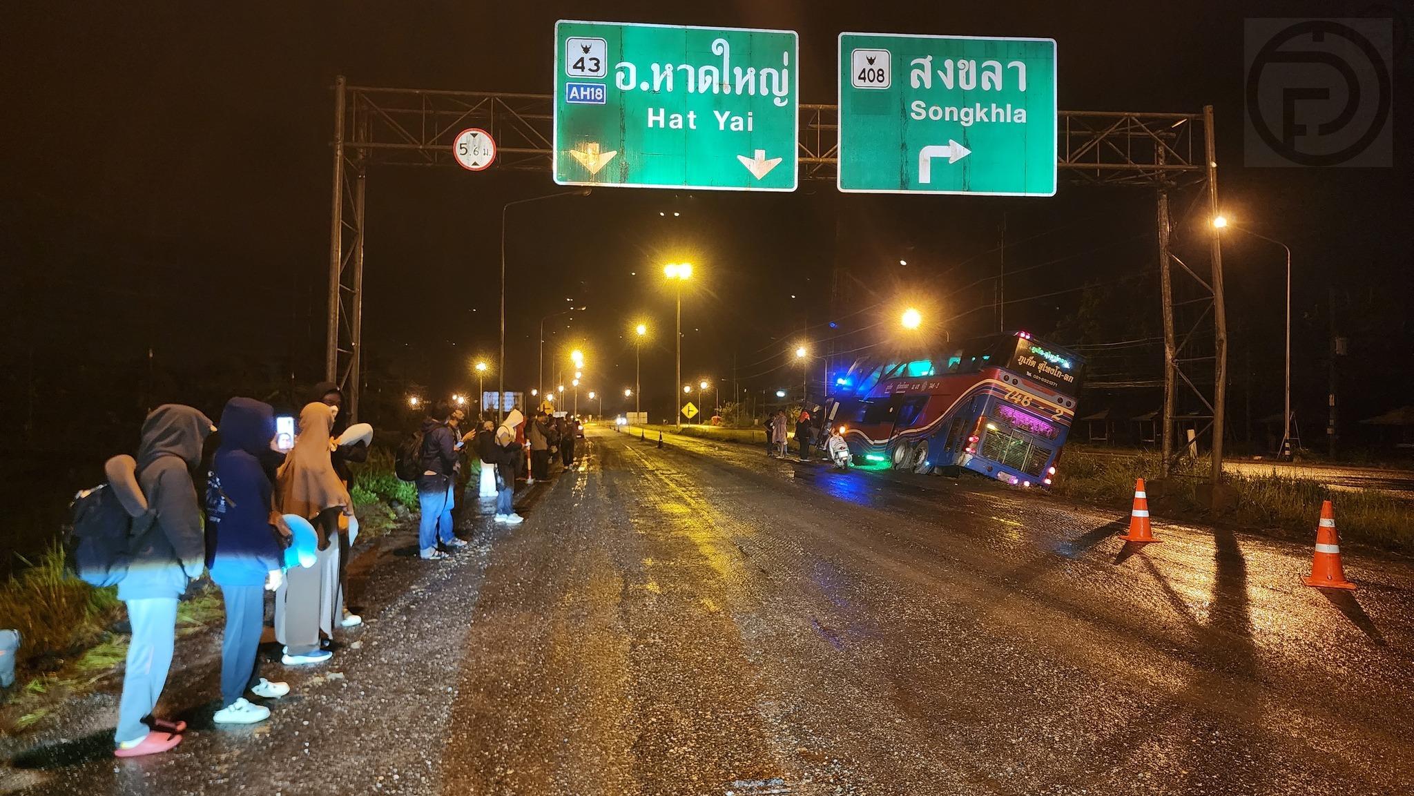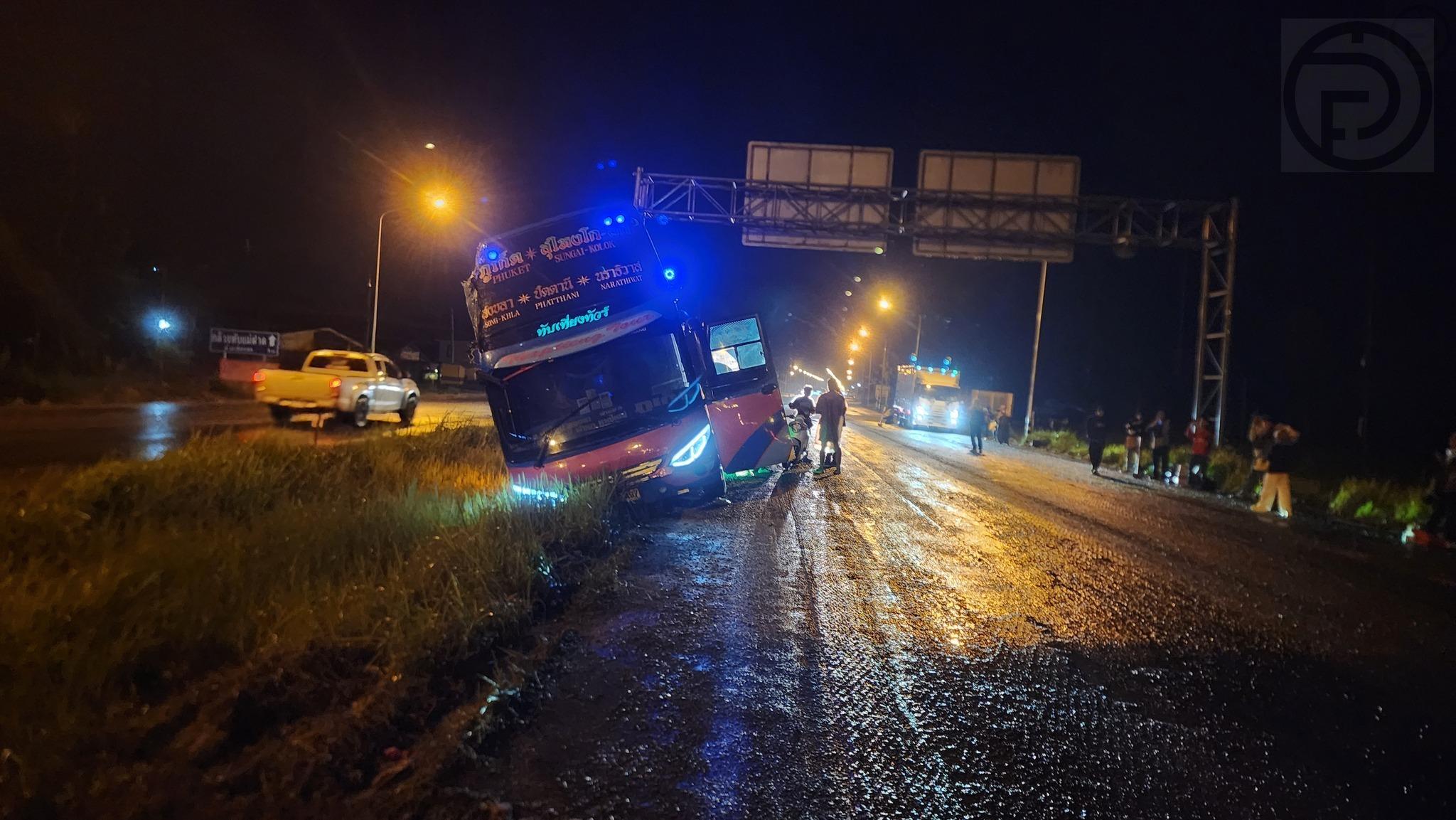 Der Unfall ereignete sich am 20. November gegen 22:00 Uhr in Khlong Pia, Chana. Dort war die Straße aufgrund von Sanierungsarbeiten teilweise bis auf den Erdboden abgetragen worden. Der Bus der Firma Srithai Tour, der auf der Strecke Sungai Kolok–Phuket verkehrte, lag auf der Seite; sein Dach war beschädigt. Die Fahrgäste warteten unverletzt am Straßenrand.