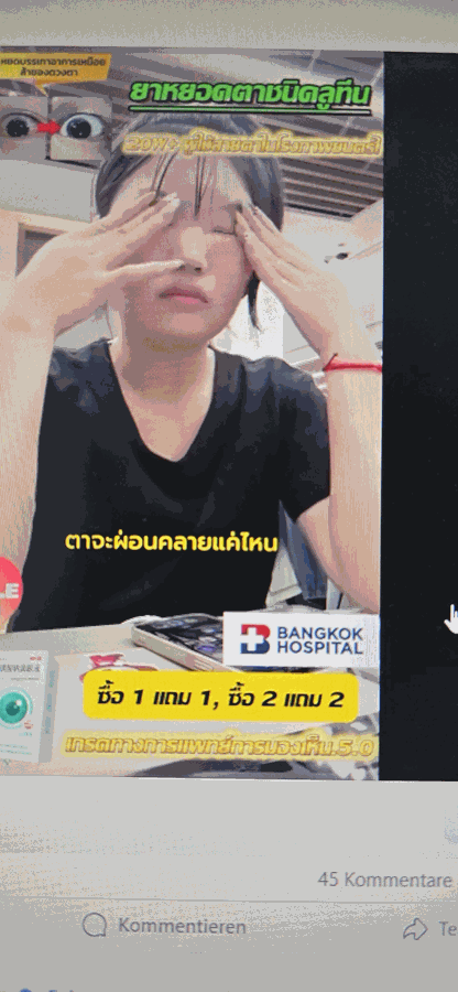 Nein, kein Implantat fürs beste Stück 😉 – sondern harmlose Augentropfen, die ich über Facebook bestellt habe. Auf der Anzeige prangte sogar das Logo vom Bangkok Hospital. Da dachte ich mir: Das klingt seriös, das kann man probieren. Als das Produkt ankam, war das Logo plötzlich verschwunden. Ich wurde misstrauisch und rief beim Hospital an. Dort die klare Antwort: „Gibt es nicht.“ Zum Glück habe ich die Tropfen nicht benutzt.