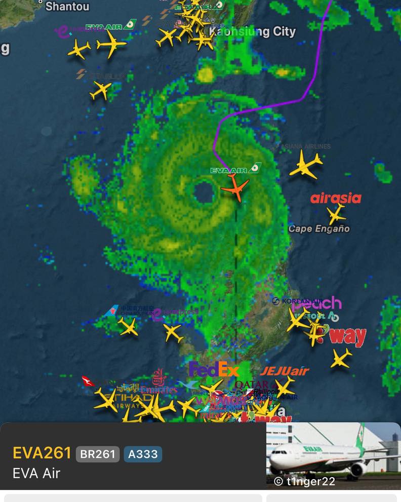 This EVA Air flight is getting a good look at Super Typhoon #Ragasa for… reasons? The aircraft is flying high enough to be above the storm, but it’s unclear why they changed their routing. Search “EVA261” to track the flight and turn on the Intense precipitation layer” in the Flightradar24 app to see the storm.