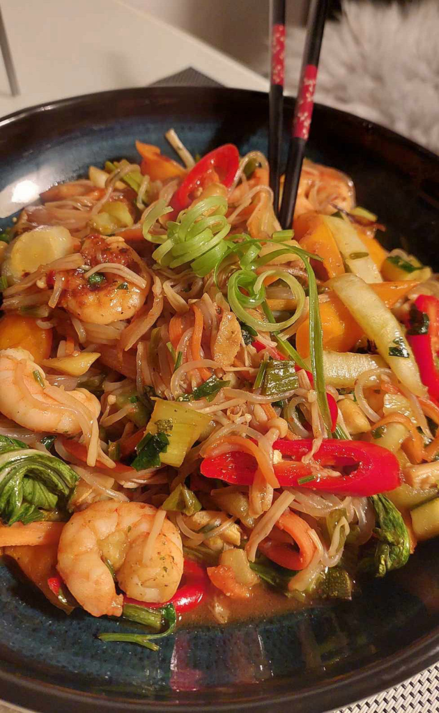 Danach Karotten| Snackpaprika| Pak Choi (grün zum Schluß)| Frühlingszwiebeln| Chili| Zucchini gewürfelt| Enoki Pilze| hinzu gegeben. Wichtig zusätzlich ein paar vorgekochte Nudeln.