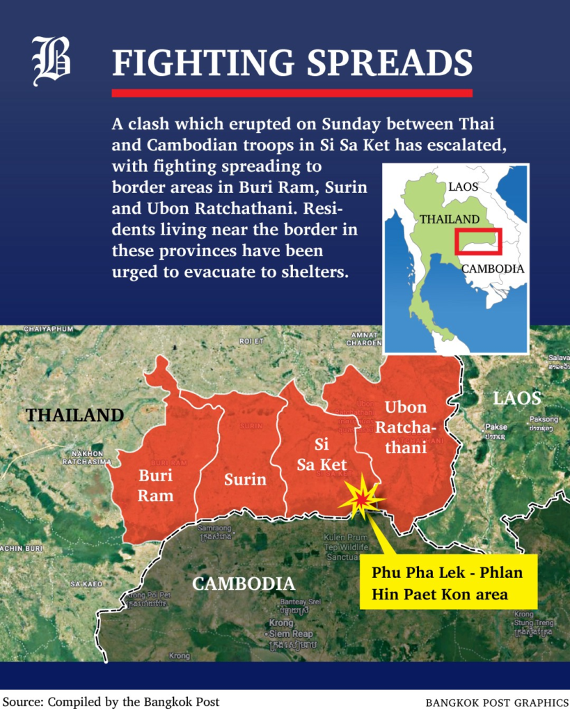Thailändische F-16-Kampfjets haben heute ein kambodschanisches Kasino in der Nähe des Grenzpasses Chong An Ma im Bezirk Nam Yuen von Ubon Ratchathani und eine kambodschanische Seilbahn in der Nähe der alten Ruinen Prasat Ta Khwai im Distrikt Phanom Dong Rak in Surin bombardiert, als Vergeltung für kambodschanische Bombardierungen und zivile Ziele entlang der Grenze.