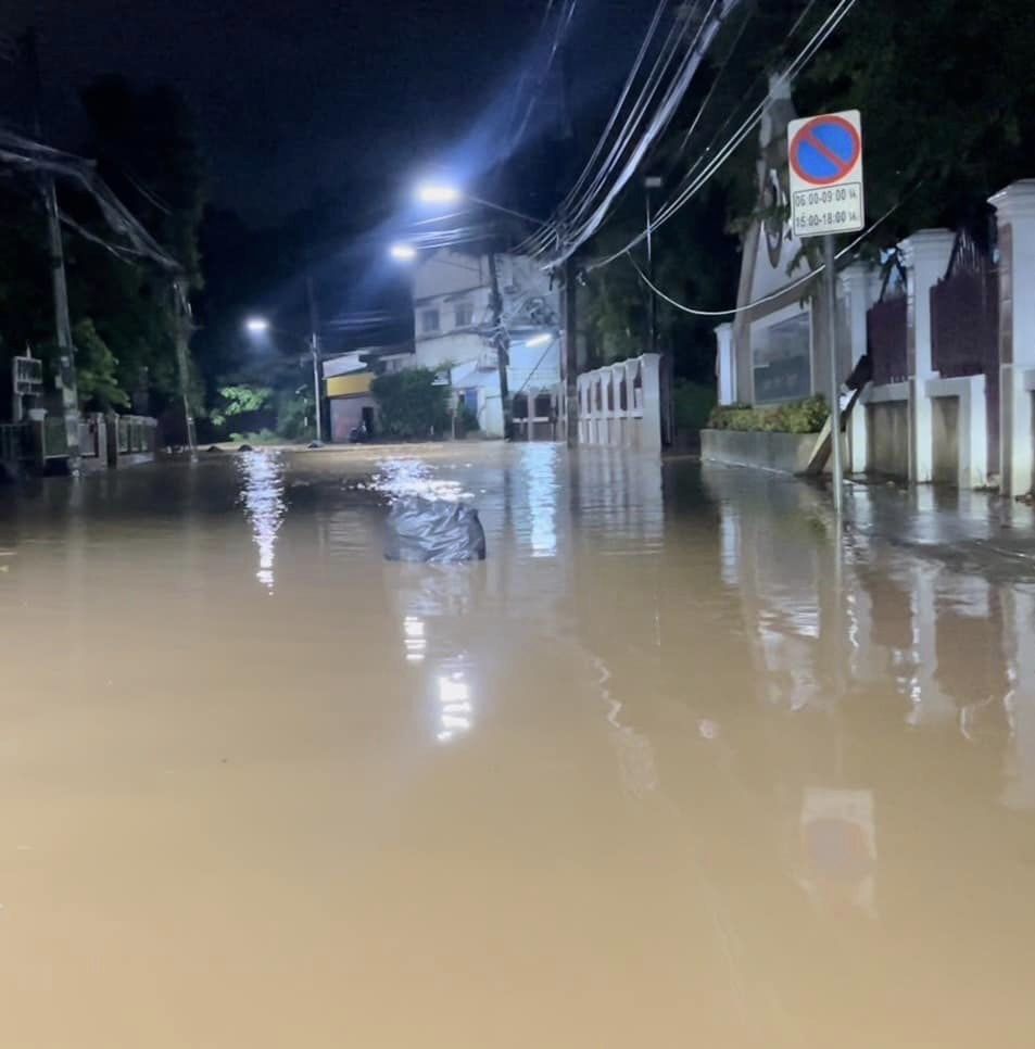 Massive Überschwemmungen treffen jetzt Chiang Mai und Chiang Rai und es wird über Nacht schlimmer. Charoen Prath Straße ist sehr überflutet!! ️ Vor dem Schulbereich, diesmal um 23.30 Uhr. Der Wasserstand steigt kontinuierlich. Straßen werden irgendwann zu Kanälen. Das Wasser ist fast 1 Meter hoch. Der Ping-Fluss ist überflutet und Chiang Mai überflutet. Die Behörden plädieren seit Stunden dafür, dass die Bewohner in höheres Gelände umziehen,